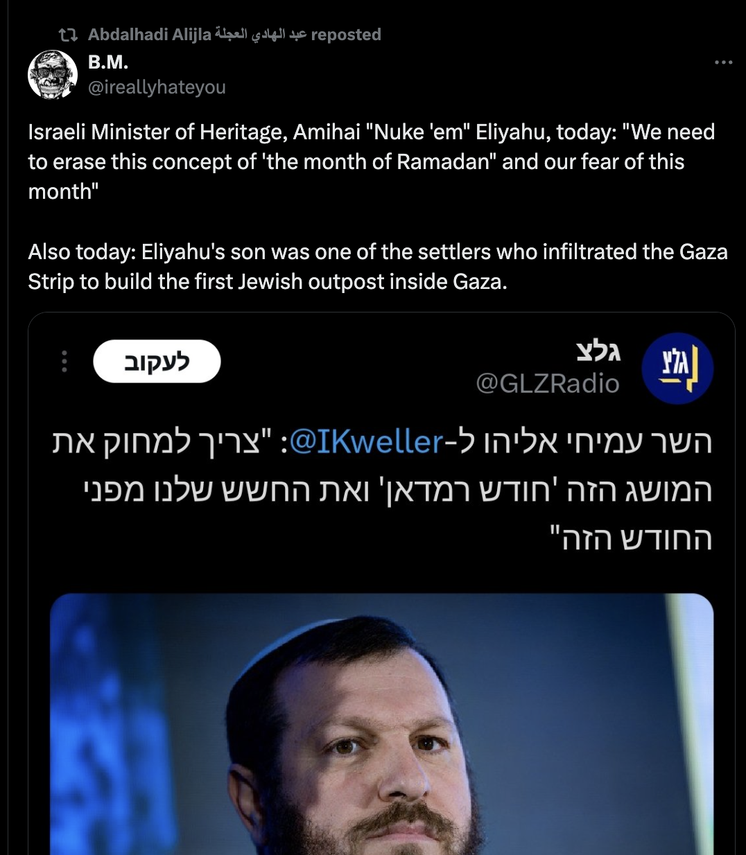 The north of the Gaza Strip, more beautiful than ever. Everything is blown up and flattened, simply a pleasure for the eyes ... We must talk about the day after. In my mind, we will hand over lots to all those who fought for Gaza over the years and to those evicted from Gush Katif” [a former Israeli settlement].