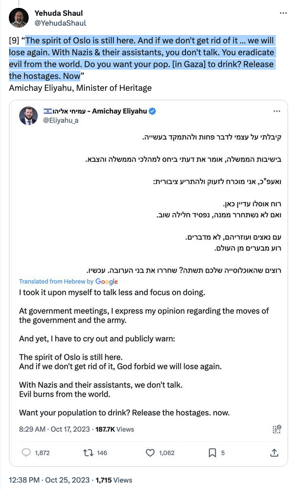 The spirit of Oslo is still here. And if we don't get rid of it … we will lose again. With Nazis & their assistants, you don't talk. You eradicate evil from the world. Do you want your pop [in Gaza] to drink? Release the hostages.