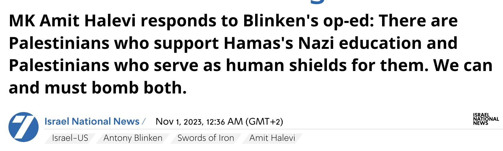 Now in Gaza there are only two types of Palestinians: Palestinians who support and are graduates of Hamas's Nazi education and Palestinians who serve as human shields for them. We can and must bomb both.