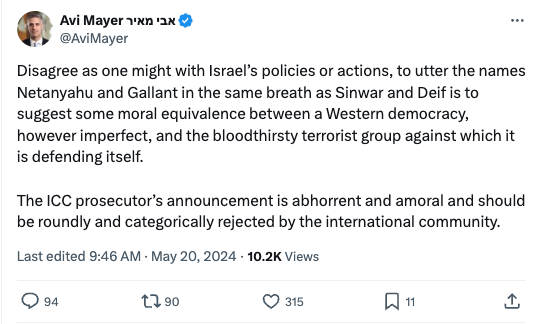 To utter the names Netanyahu and Gallant in the same breath as Sinwar and Deif is to suggest some moral equivalence between a Western democracy, however imperfect, and the bloodthirsty terrorist group against which it is defending itself. The ICC prosecutor’s announcement is abhorrent and amoral and should be roundly and categorically rejected by the international community.