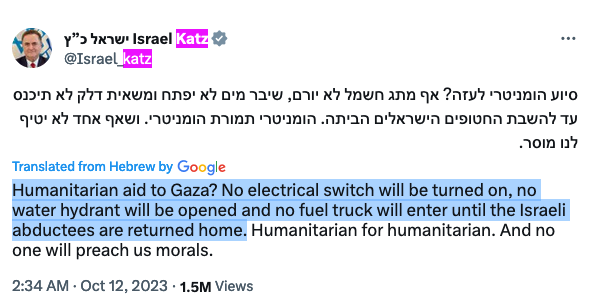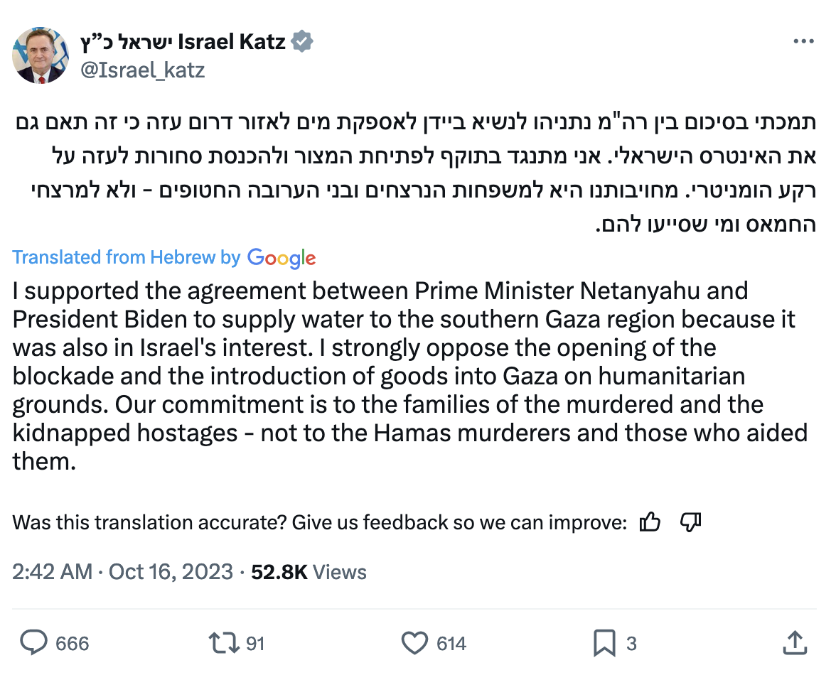 All the civilian population in gaza is ordered to leave immediately. We will win. They will not receive a drop of water or a single battery until they leave the world.