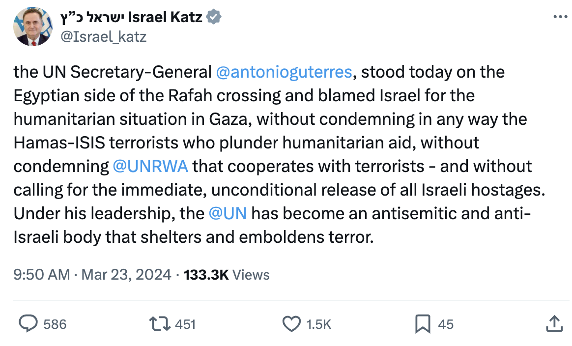 UN Secretary-General @antonioguterres, stood today on the Egyptian side of the Rafah crossing and blamed Israel for the humanitarian situation in Gaza, without condemning in any way the Hamas-ISIS terrorists who plunder humanitarian aid, without condemning @UNRWA that cooperates with terrorists - and without calling for the immediate, unconditional release of all Israeli hostages. Under his leadership, the @UN has become an antisemitic and anti-Israeli body that shelters and emboldens terror.