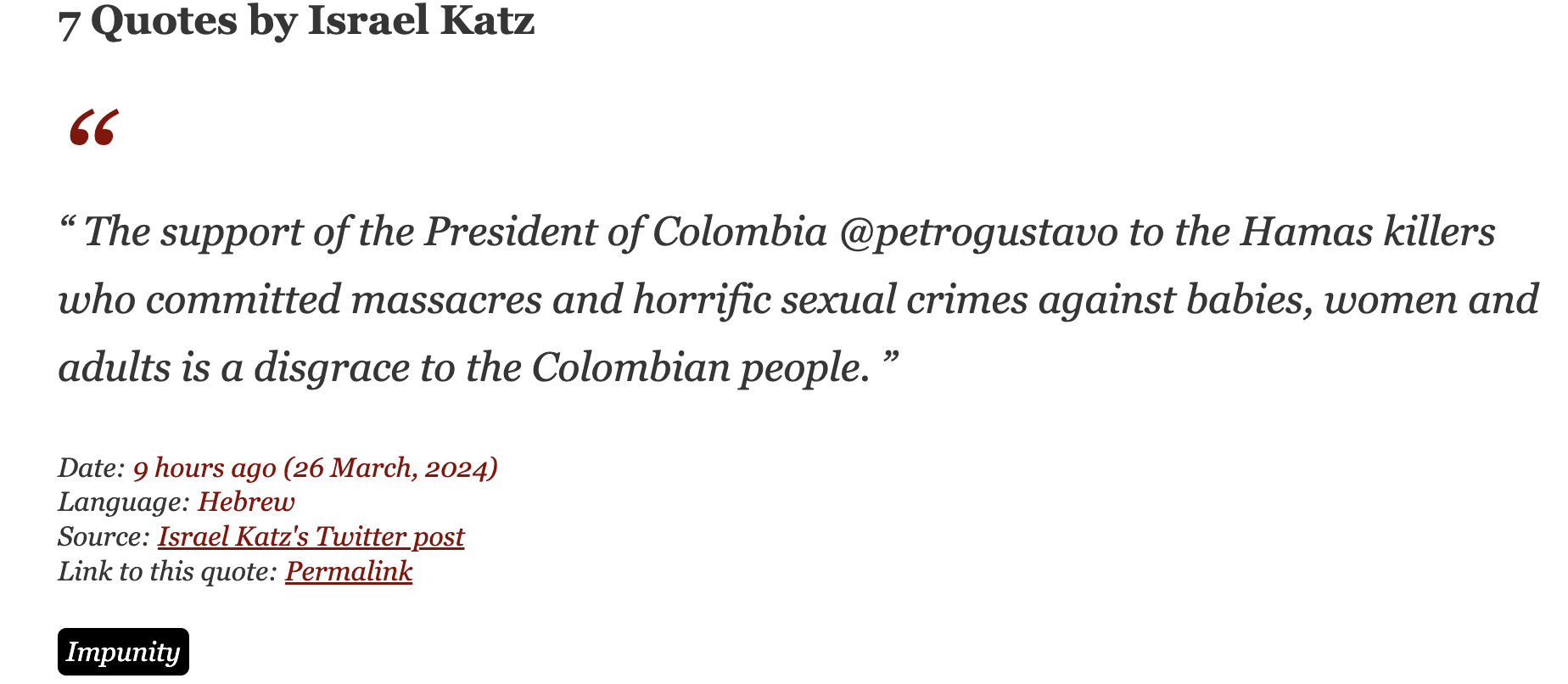 The support of the President of Colombia @petrogustavo to the Hamas murderers who committed massacres and horrific sexual crimes against babies, women and elderly is a disgrace to the Colombian people.