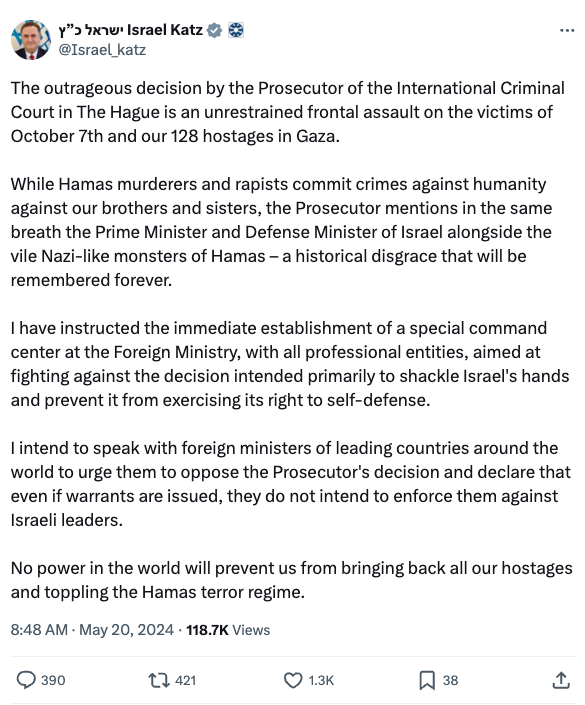 I have instructed the immediate establishment of a special command center at the Foreign Ministry, with all professional entities, aimed at fighting against the decision intended primarily to shackle Israel's hands and prevent it from exercising its right to self-defense. I intend to speak with foreign ministers of leading countries around the world to urge them to oppose the Prosecutor's decision and declare that even if warrants are issued, they do not intend to enforce them against Israeli leaders.