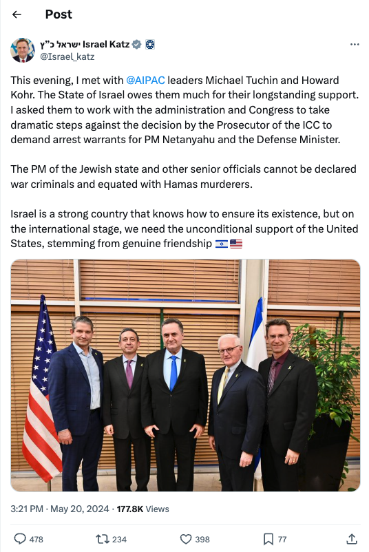 I met with @AIPAC leaders Michael Tuchin and Howard Kohr. The State of Israel owes them much for their longstanding support. I asked them to work with the administration and Congress to take dramatic steps against the decision by the Prosecutor of the ICC to demand arrest warrants for PM Netanyahu and the Defense Minister.