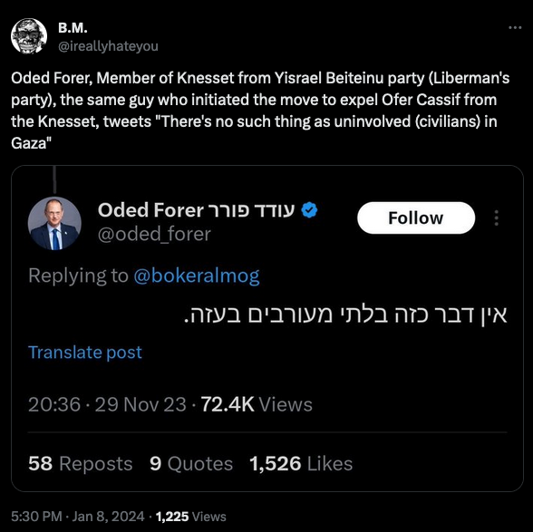 There is no such thing as innocent people in Gaza... The biggest enemy of the children in Gaza is people like them (MKs Ofer Cassif & Aida Touma Sliman)... who keep their mouths shut when... they (Palestinians) raise an entire population of Nazis.