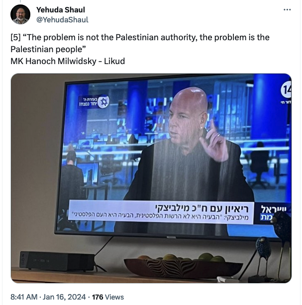 I would like to say that we, in Israel, at least the population, are not interested in all this rational Palestinian talk. For us, there is one purpose: to destroy Gaza, to destroy this absolute evil. To destroy this. There is no chance that after the holocaust, Jewish people will live similar experiences as they [experienced] 80 years ago.