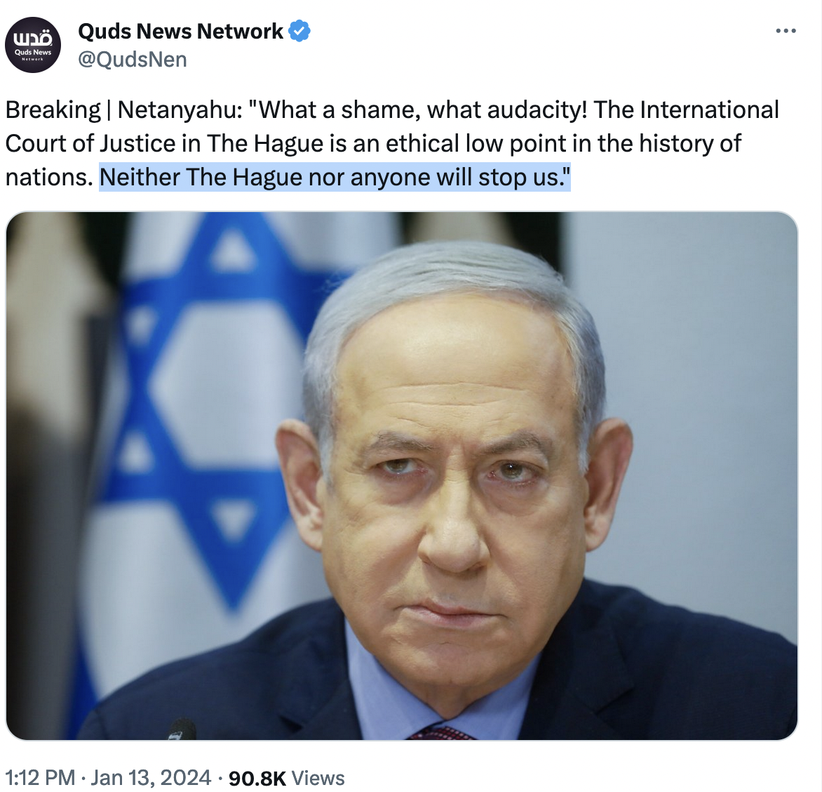 34. The announcement of the prosecutor at the ICC is beyond outrageous, and shows the extent to which the international judicial system is in danger of collapsing … We expect all leaders in the free world to condemn outright this step and firmly reject it.