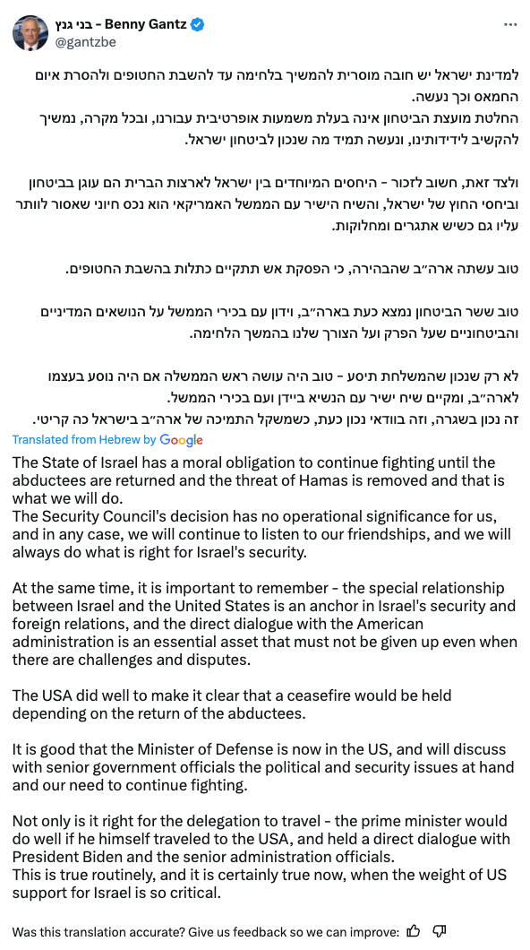74. The Security Council's decision has no operational significance for us, and in any case, we will continue to listen to our friendships, and we will always do what is right for Israel's security.