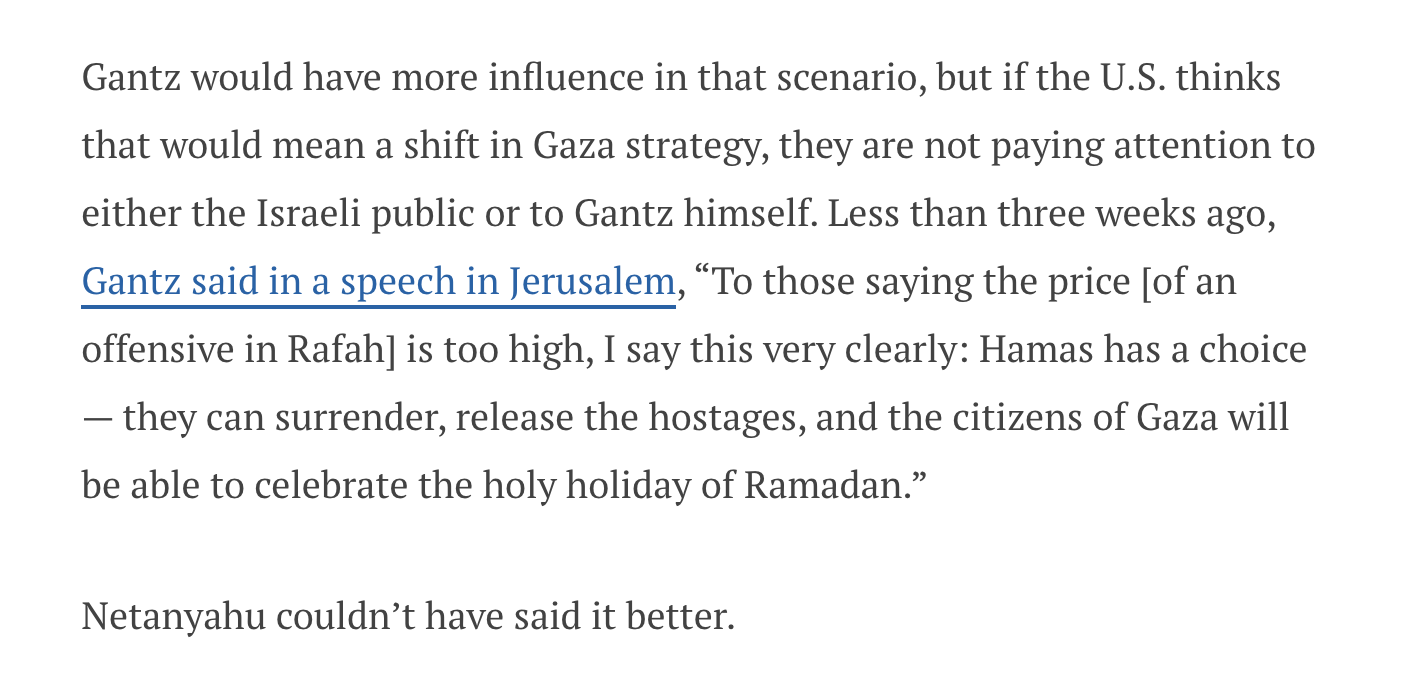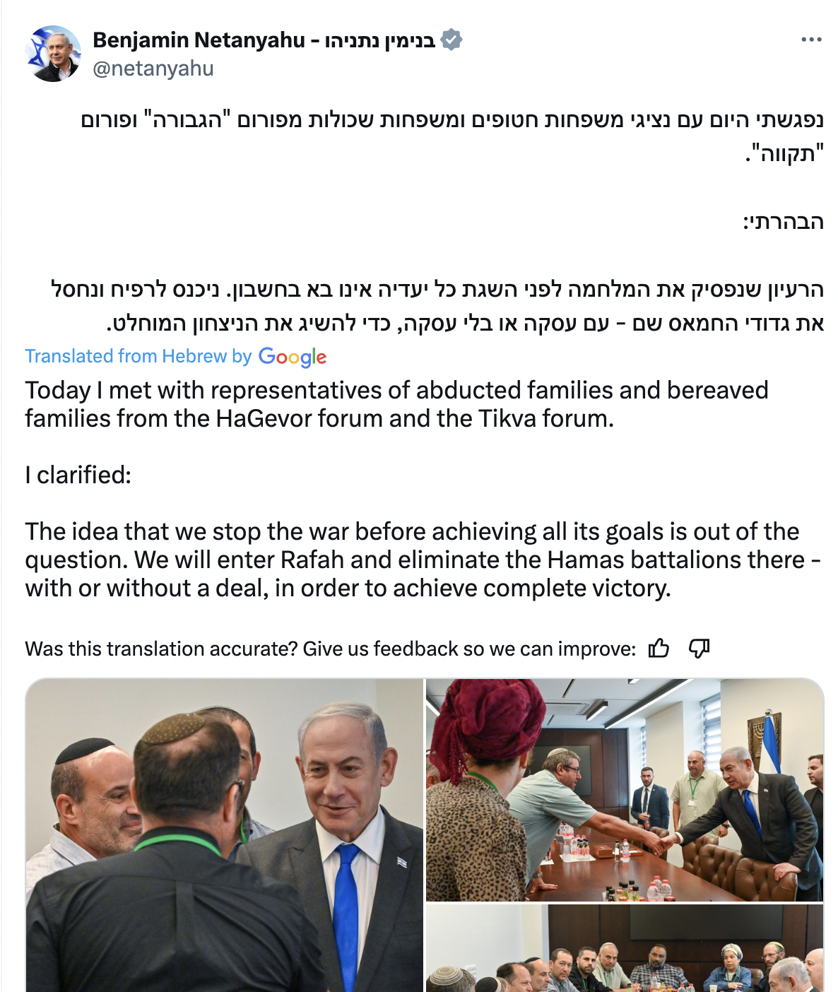 77. I met with Secretary of State Blinken. ... I told him I hope we would do this [invade Rafah] with US support, but if necessary -- we will do it alone.