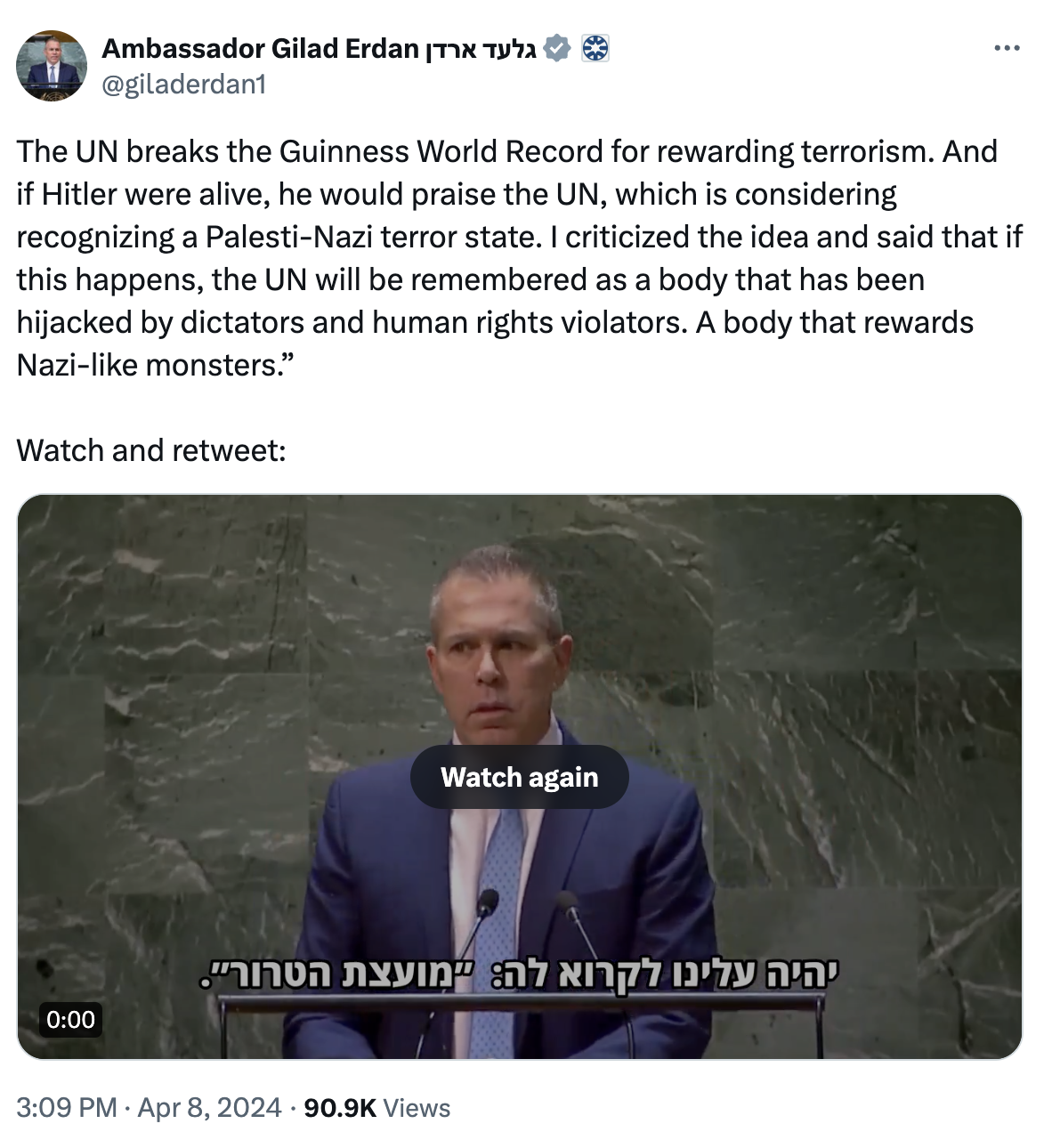 70. The UN breaks the Guinness World Record for rewarding terrorism. And if Hitler were alive, he would praise the UN, which is considering recognizing a Palesti-Nazi terror state. I criticized the idea and said that if this happens, the UN will be remembered as a body that has been hijacked by dictators and human rights violators. A body that rewards Nazi-like monsters.