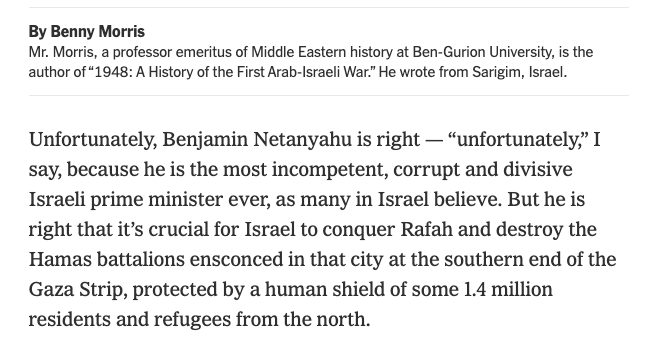 67. Benjamin Netanyahu ... is right that it’s crucial for Israel to conquer Rafah and destroy the Hamas battalions ensconced in that city at the southern end of the Gaza Strip, protected by a human shield of some 1.4 million residents and refugees from the north.