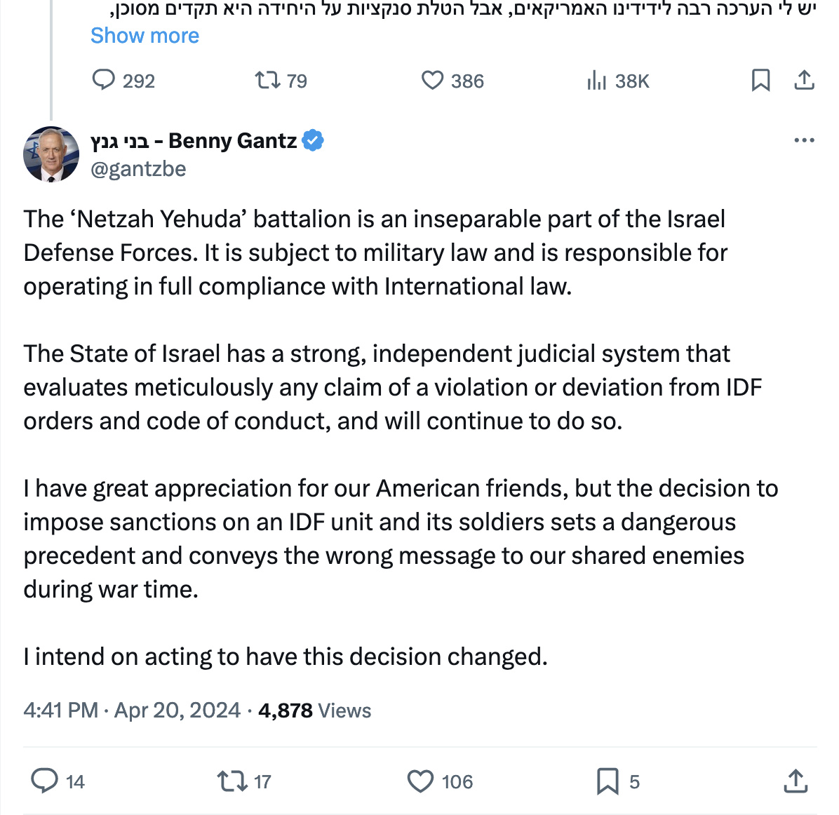 65. The ‘Netzah Yehuda’ battalion is an inseparable part of the Israel Defense Forces ... the decision to impose sanctions on an IDF unit and its soldiers sets a dangerous precedent and conveys the wrong message to our shared enemies during war time. I intend on acting to have this decision changed.
