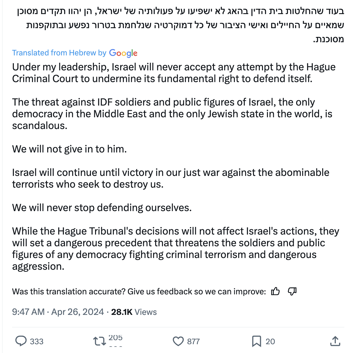28. It's inconceivable that arrest warrants are issued after they massacred us on October 7. It's unforgivable. We are waging a just war, and let's be clear - we will not let this pass in silence … We call on the Americans - I expect the administration to stand behind us and for Congress to convene and condemn the arrest warrants.