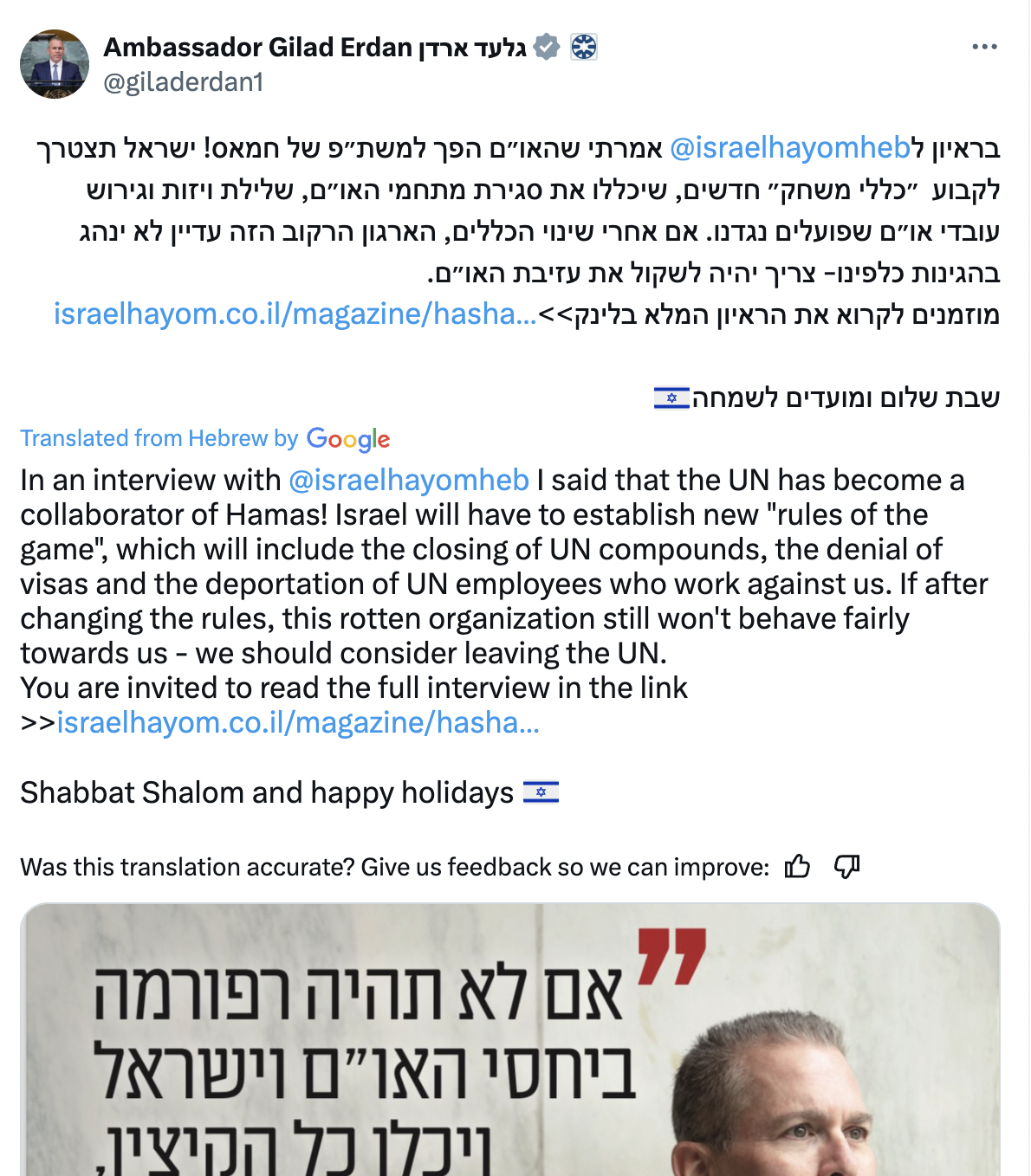 62. In an interview with @israelhayomheb I said that the UN has become a collaborator of Hamas! Israel will have to establish new "rules of the game", which will include the closing of UN compounds, the denial of visas and the deportation of UN employees who work against us. If after changing the rules, this rotten organization still won't behave fairly towards us - we should consider leaving the UN.