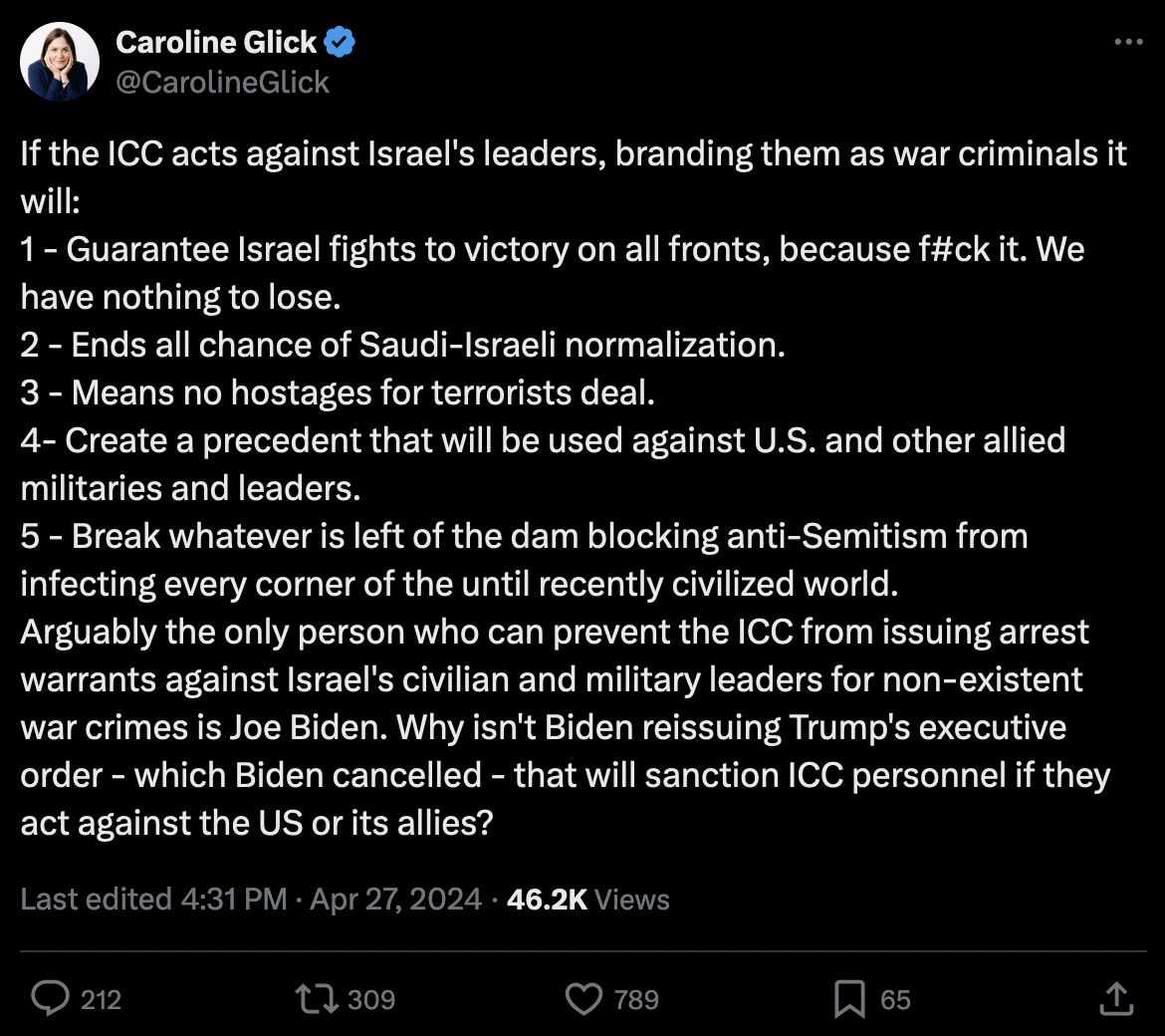 59. If the ICC acts against Israel's leaders, branding them as war criminals it will guarantee Israel fights to victory on all fronts, because f#ck it. We have nothing to lose.