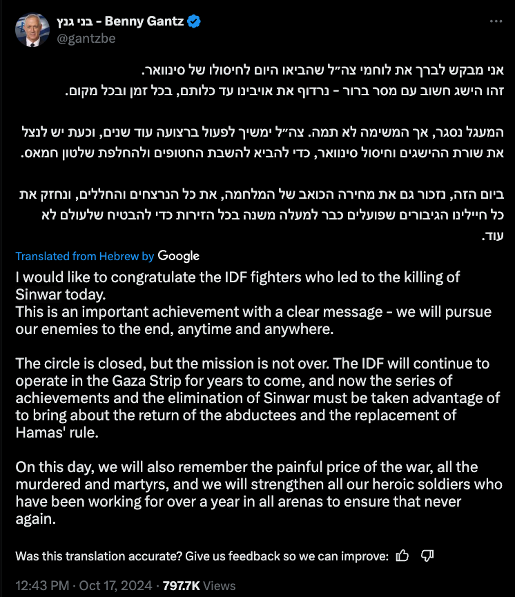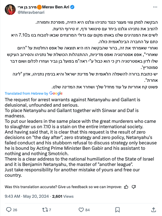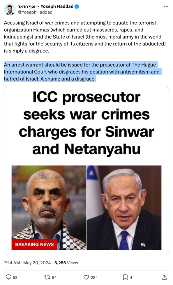 43. Insane! Report: The chief prosecutor at Criminal Court at The Hague wants to issue arrest warrants for Netanyahu, Gallant, and Sinwar. A delusional prosecutor who equates the abominable murderer Sinwar with the Prime Minister and the Minister of Defense.