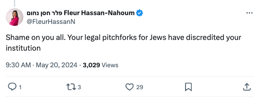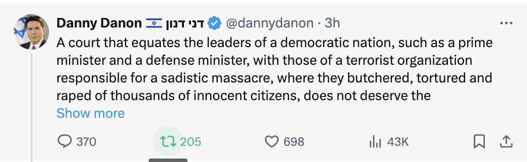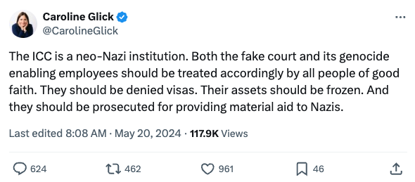 46. [The ICC Prosecutor Karim Khan] is callously pouring gasoline on the fires of antisemitism that are raging across the world. Through this incendiary decision, Mr. Khan takes his place among the great anti-Semites of modern times. He now stands alongside those infamous German judges that donned their robes and upheld laws that denied the Jewish people their most basic rights, and enabled the Nazis to perpetrate the worst crime in history.