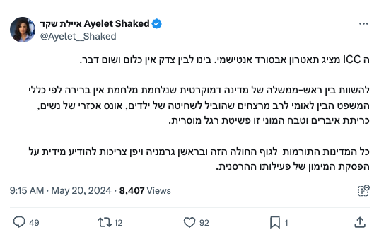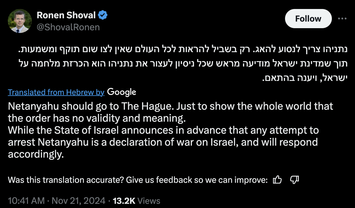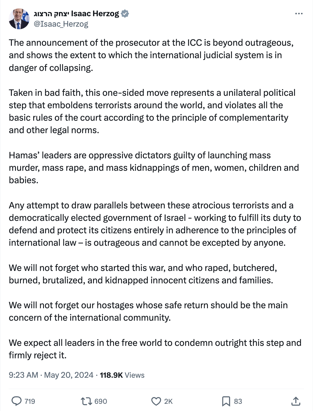 33. The ICC arrest warrants are a complete moral failure, we cannot accept the outrageous comparison between Netanyahu and Sinwar, between the leaders of Israel and the leaders of Hamas.