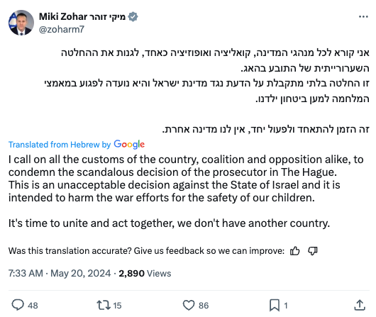 27. The statement of the chief prosecutor in The Hague, which puts the prime minister and the defense minister in the same line as the heads of Hamas, shows that sending representatives of Israel to the deliberation at the antisemitic court was a serious mistake to begin with. The prime minister and the defense minister must ignore the antisemitic prosecutor of the antisemitic court, and to order the escalation of the attack against Hamas until its absolute submission.