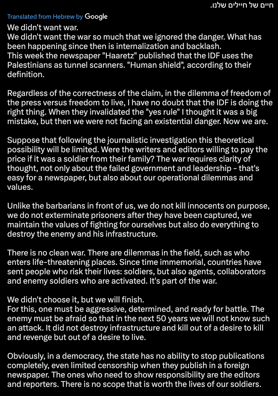 14. This week the newspaper "Haaretz" published that the IDF uses the Palestinians as tunnel probes. "Human shield", according to their definition … There is no clean war. There are dilemmas in the field, such as who enters life-threatening areas … There is no scoop worth the lives of our soldiers.