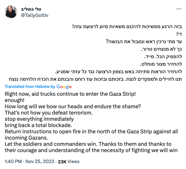 At this very moment, aid trucks continue to enter the Gaza Strip! enough! How long will we bow our heads and endure the shame? That's not how you defeat terrorism. stop everything immediately bring back a total blockade. Return instructions to open fire in the north of the Gaza Strip against all incoming Gazans.