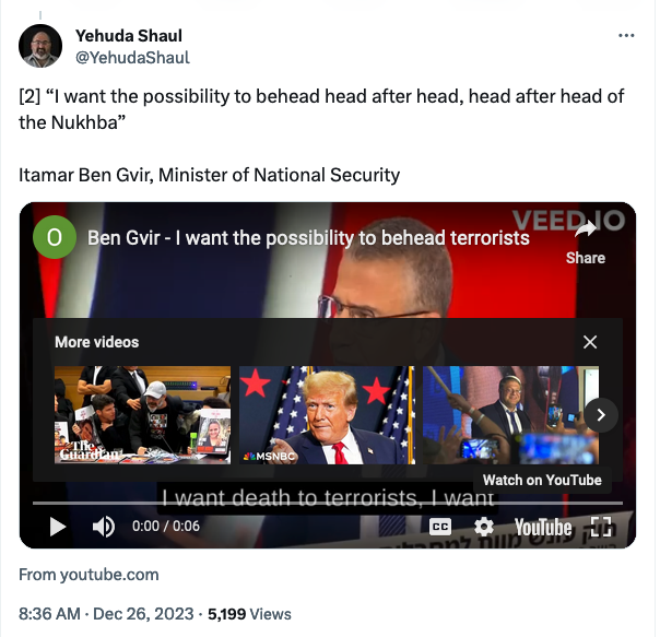 The price they must pay for what they've done to us should not be limited to merely punishing, the killing of insurgents. We are not talking about a conflict imposed on us, that's illogical. We refer to them as 'spaces,' while they call them 'land,' from which the word 'human' is derived. In the Middle East, it means that a human without land is worth nothing and has no right to exist. Therefore, the price they must pay for it to impact future generations is that we must take their land. First, we must take the land, after we have taken their land, we'll think about what we'll do next. The second thing we need to push for, despite all voices and opinions, is new migration and helping them find a new life. Gaza is certainly now destroyed and not suitable for human habitation. And I expect the Western world, as they did by welcoming a million Syrian refugees, to open their doors and welcome the people of Gaza.