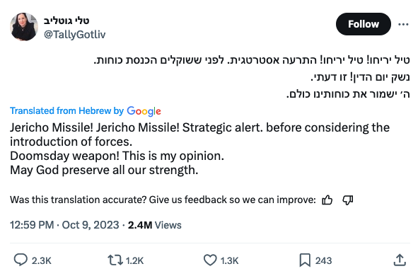 One of the options is to drop an atomic bomb on Gaza. I pray & hope for their [hostages] return, but there is also a price in war.