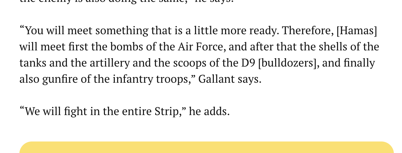 This [attack] is not enough, there should be more, there should be no limits to the response, I said it a million times, until we see hundreds of thousands fleeing Gaza, we, the IDF has not achieved its mission, this is a phase that should happen, I am saying this cause these are instructions that were said to the IDF [...] I also do not want [the IDF] to get inside [Gaza] before crushing everything, I’d rather the falling of fifty buildings than one more casualty to our forces.
