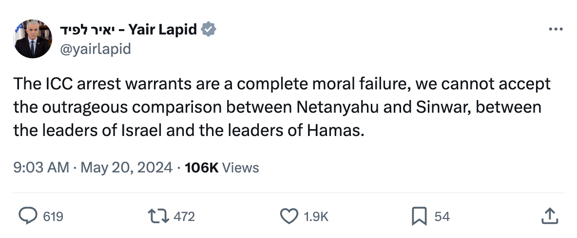 The ICC arrest warrants are a complete moral failure, we cannot accept the outrageous comparison between Netanyahu and Sinwar, between the leaders of Israel and the leaders of Hamas.